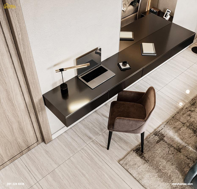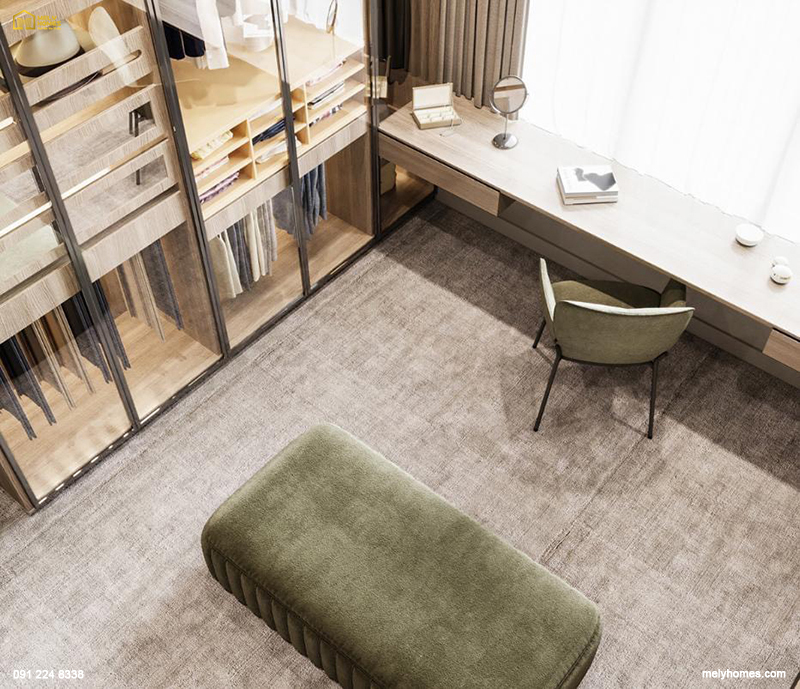 Tá»§ quần áo cánh kính và bàn làm việc được bố trí tách biệt vá»›i nhau, nhưng trong má»™t không gian chung nhằm táºn dụng tối Ä‘a không gian để bố trí đầy đủ tính năng.