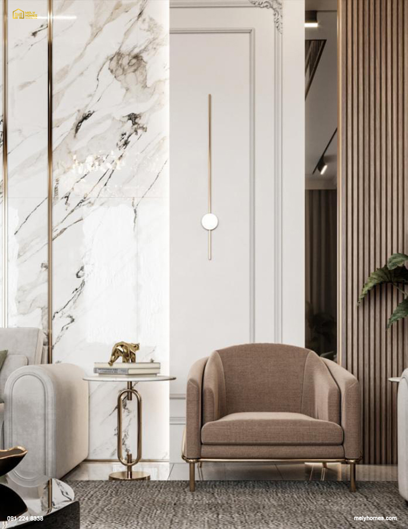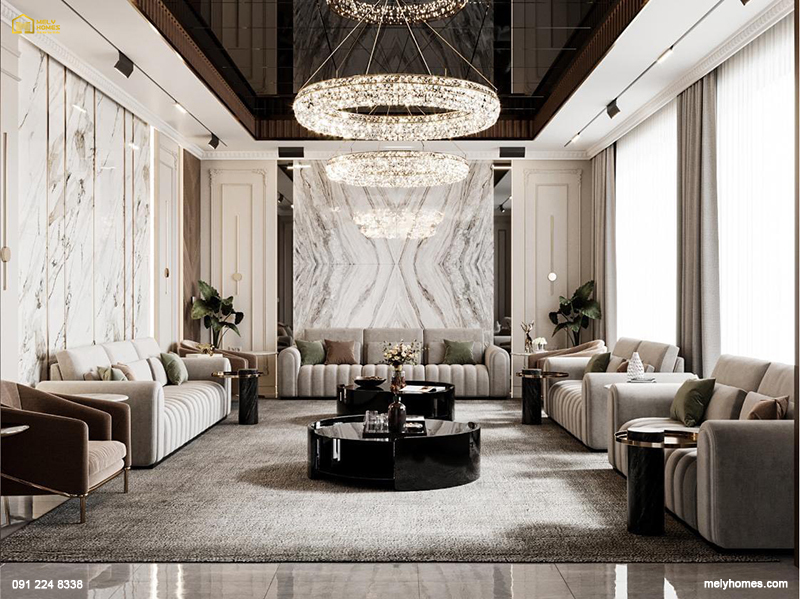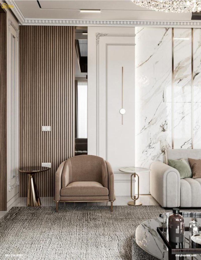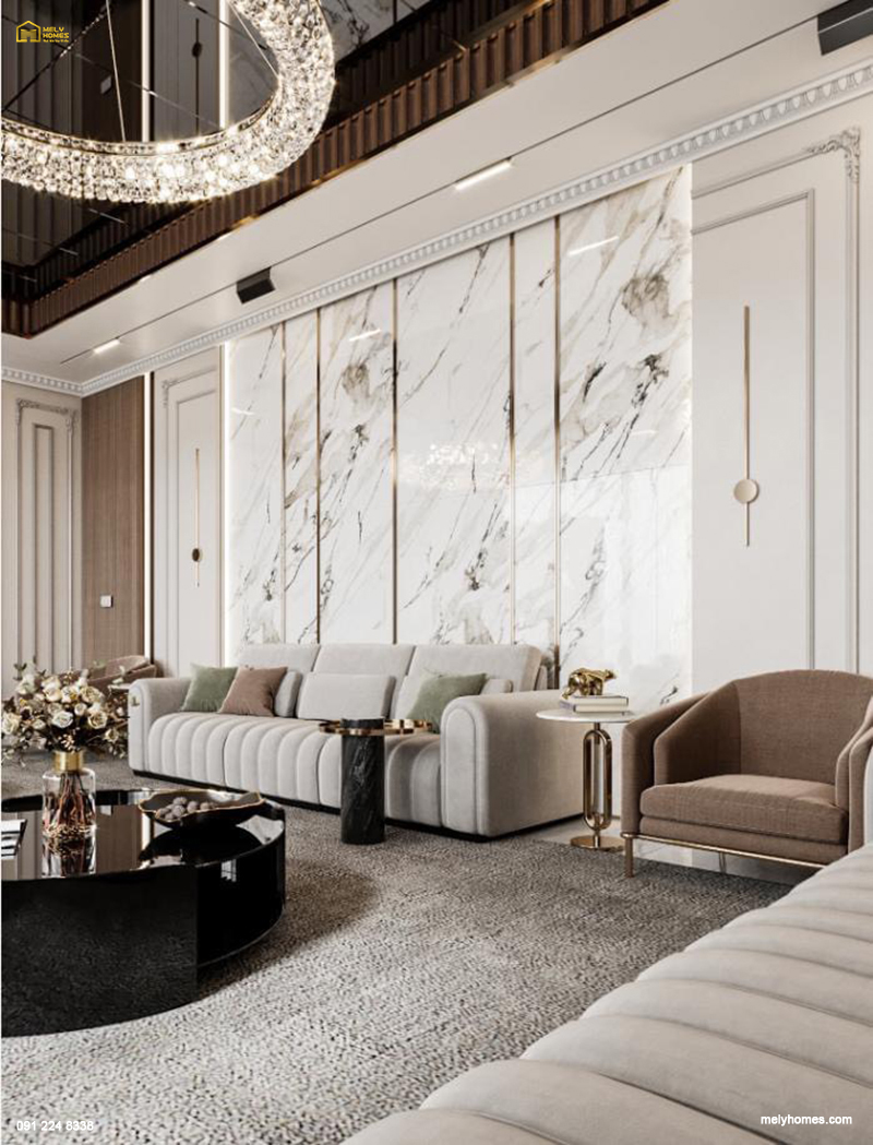 Sá»± sang trá»ng trong phòng khách có được nhá» cách bố trí khoảng cách và sá»± kết hợp váºt liệu hợp lý, có tráºt tá»±, mà kiến trúc sư chuyên môn cao cá»§a Melyhomes Ä‘ã dành nhiá»u tâm huyết thiết kế nên. Và Ä‘iá»u đặc biệt là trong cái sá»± sang trá»ng ấy bạn vẫn có thể cảm thấy yên bình nhá» việc sá» dụng màu sắc trung tính nhẹ nhàng. Các chi tiết trang trí tạo ra sá»± cân bằng giữa động và tÄ©nh.